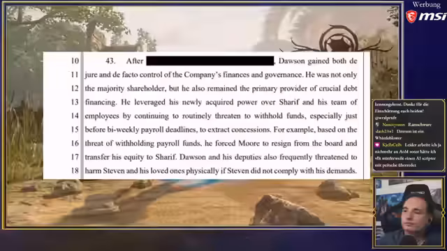 04:58:52Mehrere Klagen wurden im Zusammenhang mit Ashes of Creation eingereicht. Ehemalige Mitarbeiter klagen auf fehlende Gehälter und Verstöße gegen den Warn Act. Die Investoren Karen Borreco und TFE Games haben ebenfalls Klagen eingereicht. TFE wirft Sharif und Moore vor, zwischen 10 und 20 Millionen Dollar aus der Firma in private Taschen gesteckt zu haben. Die Klage fordert Einsicht in alle Finanzen und technische Daten, da Sharif angeblich noch Zugangsdaten unter Verschluss hält. Dies ist vermutlich der Beginn einer Reihe von rechtlichen Auseinandersetzungen.