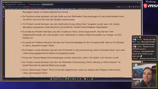 05:37:25Der Streamer äußert seine gemischten Gefühle zu Anno 117 nach drei Monaten nach dem Release. Während er die Kernmechanik und das Aufbauspiel weiterhin als genial ansieht, zeigt er sich frustriert über den langsamen Fortschritt bei der Fehlerbehebung. Konkret erwähnt er einen eigenen, nach wie vor bestehenden Bug, der ihm anzeigt, er habe keinen Gott für seine Inseln gewählt, obwohl dies nicht stimmt. Diese wiederkehrenden visuellen und mechanischen Probleme lassen ihn an der zukünftigen Entwicklung des Spielen zweifeln.