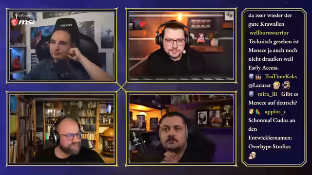 00:34:24Nachdem die technische Stabilität hergestellt ist, beginnt die Ehrenrunde offiziell. Die Gäste, RangerArea, Steinwallen und Bonjwa, stellen nacheinander ihre drei am meisten erwarteten Spiele des Jahres 2026 vor. Steinwallen startet mit dem Platz-drei-Spiel Menace, ein komplexes Sci-Fi-Rundentaktikspiel im Early Access. Er beschreibt es als ein Juwel mit tieferer Mechanik, das jedoch eine abschreckende, trockene Optik hat.