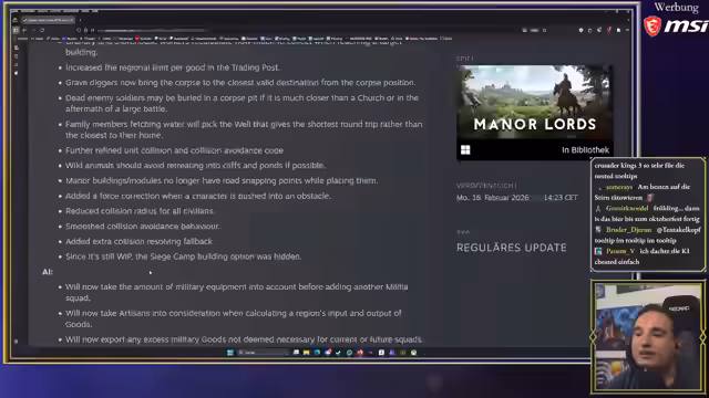 02:33:34Der Fokus liegt auf dem neuen Manor Lords Beta-Update, das keine Revolution, aber signifikante Änderungen mit sich bringt. Das wichtigste Feature ist die Einführung einer neuen Häuserstufe. Die bisherige Stufe 3 wird zur Stufe 4, und eine neue Stufe 3 dazwischen eingefügt. Diese neue Stufe schließt spielmechanisch wichtige Gebäude wie den Bäcker und den Schuster erst ab, was die Siedlungsentwicklung grundlegend verändert und die kommunale Bäckerei deutlich aufwertet. Weitere Änderungen betreffen die Zuweisung von Arbeitern zu Ochsen, eine neue Map namens 'Zwillingsseen' und Balancing-Änderungen bei Getreidesorten.