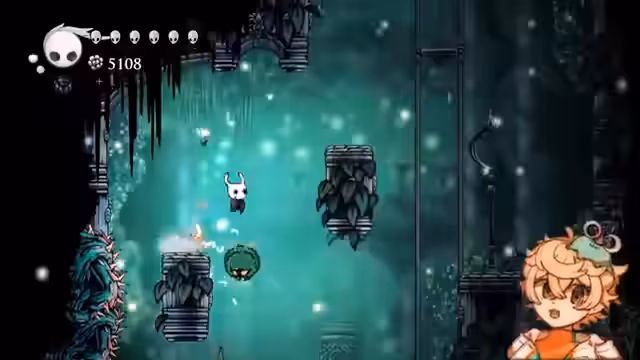 06:34:02Nach dem erfolgreichen Betreten des neuen Gebiets stellt der Streamer fest, dass er sich verlaufen hat. Er muss die richtige Technik anwenden, um in die obere Ebene zu gelangen und gelangt schließlich in einen Raum mit dem 'Gefäß'. Dort findet er auch wichtige Raupen, die er für den 100%-Spielstand benötigt und sammelt sie auf.