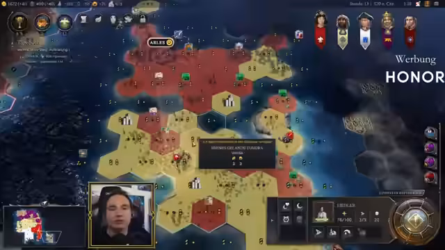 01:29:31Der Streamer setzt seine diplomatischen Bemühungen fort, wobei Karl der Große misstrauisch bleibt und Minuspunkte für aufgedeckte Spionage vergibt. Die Entdeckung des Kontinents Asi-Amerika und eines feindlichen Stadtstaates unter der Führung von Ahsoka dem Welteroberer wird bekannt gegeben. Spezialisten werden eingesetzt, und der Bau von Händlern wird priorisiert, um Handelsbeziehungen zu etablieren. Ein Angriff eines Mini-Staates wird abgewehrt, und der Fokus liegt auf dem Erwerb von Gewürzen und Wissenschaft durch Handel. Es werden Handelswege zu Städten wie Per Atium eingerichtet, und die Erkundung der Landschaft durch eine Kogge führt zur Entdeckung weiterer Schatzflotten-Ressourcen. Der Streamer entscheidet sich für den Bau eines Gildenhauses für mehr Kultur und überlegt, die Kaserne zu überbauen, um zusätzliche Kultur zu erhalten. Der Brennofen wird in Erwägung gezogen, um das Monument zu überbauen, und das Bildungswesen wird als nächstes erforscht. Der Siedler gründet eine neue Stadt, und der Späher entdeckt feindliche Aktivitäten, was die Notwendigkeit einer Schatzflotten-Siedlung nahelegt.