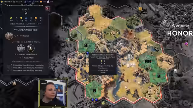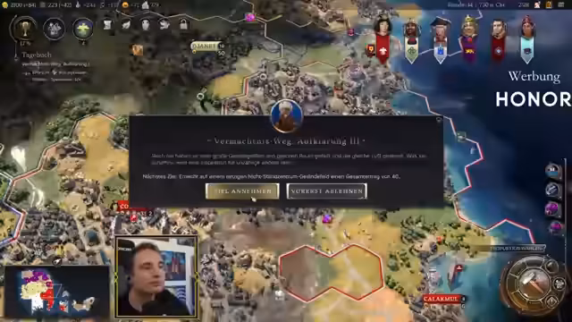 03:56:59Der Streamer ist sich unsicher, welchen Sieg er anstreben soll, tendiert aber aufgrund des bisherigen Fokus auf Wissenschaft. Er plant, im nächsten Zeitalter mehrere Pfade zu verfolgen. Das Mogulreich wird durch Handel freigeschaltet, was zusätzliche Wissenschaft ermöglicht. Die Ming-Mauer wird als cool empfunden und bringt viel Gold ein. Ein weiteres Siedlungslimit wird erreicht. Friedrich führt Krieg gegen Hatschepsut und Karl den Großen. Der Streamer vermutet, dass Friedrich den Krieg erklärt hat und somit schuld ist. Die Ming-Mauer kann nicht vollständig durchgezogen werden. Alle Städte sollen Kultur produzieren, um das Städtelimit zu erreichen. Ein zweites Feld mit 40 Ertrag wird entdeckt. Das Wissenschaftsziel wird als lehrreich empfunden, da es Einblicke in die Ertragsoptimierung gibt. Eine weitere Siedlung soll gegründet oder eingemeindet werden. Es wird überlegt, ob Schatzflottenressourcen auch durch Handel funktionieren. Ein Händler soll in eine Stadt umgewandelt werden. Die Mauer bringt zusätzliche Erträge, insbesondere in Siedlungen mit einer Bank. Ein fünftes Feld mit 40 Ertrag wird erreicht. Der Streamer findet das Wissenschaftsziel sehr cool, da er viel über die Optimierung von Erträgen lernt. Es wird überlegt, eine weitere Siedlung zu gründen oder eine Gemeinde einzugemeinden. Der Streamer überlegt, ob er eine neue Stadt gründen soll, um Schatzressourcen zu erhalten, oder ob es sinnvoller ist, einen Stadtstaat einzugemeinden.