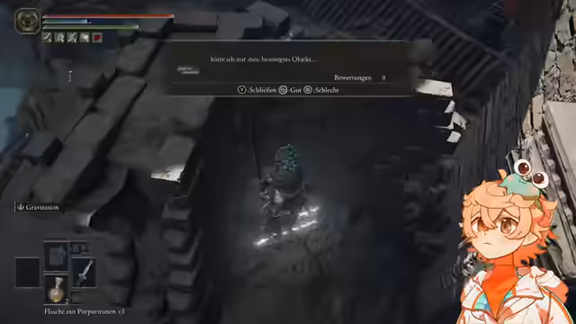 04:17:05Nachdem der Streamer sich verirrt hat und keinen Speicherpunkt findet, unternimmt er einen verzweifelten Versuch, die feindlichen Gegner zu umlaufen. Nach anfänglichem Scheitern gelingt es ihm, einen der Gegner zu töten und entdeckt dabei eine wertvolle 'Maske des Grittensenmahls'. Er nutzt die gewonnene Zeit, um zur nächsten Gnade zu eilen und sich auf den nächsten Boss vorzubereiten.