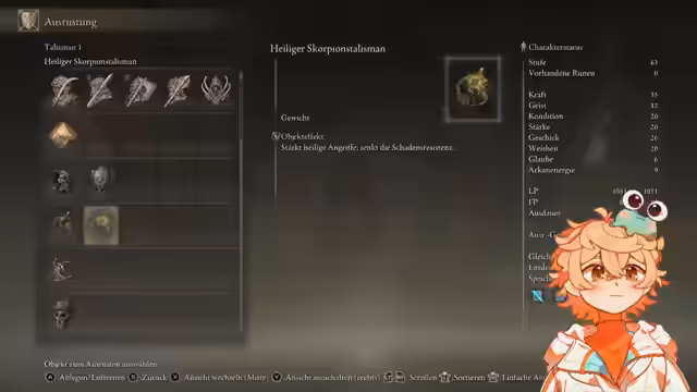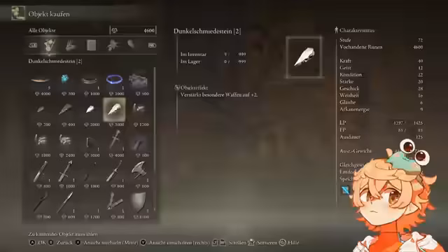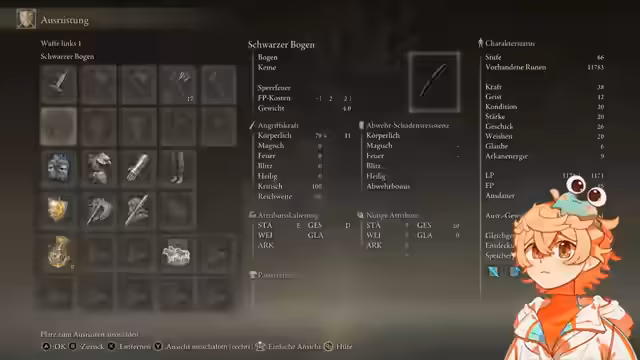 09:22:14Die Suche nach einem Upgrade für die aktuelle Waffe und speziell nach einem Dunkelschmiedestein 7 dominiert den Anfang des Stream-Abschnitts. Der Streamer testet verschiedene Ausrüstungskombinationen und überlegt, ob es sinnvoll wäre, von Geschick auf Weißheit umzuskillen, ist sich aber letztlich nicht sicher. Entscheidend ist, dass er nicht zufrieden mit seiner aktuellen Waffe ist und alternative Optionen wie einen Hut mit Geschickschaftsbonus in Betracht zieht.
