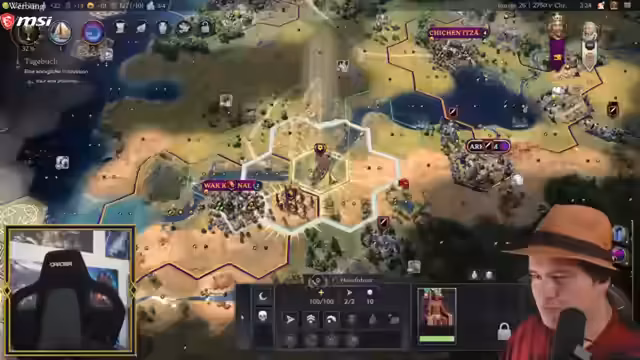 01:26:20Der Streamer erklärt, dass eigene Städte immer alle Ressourcen zählen, die man hat. Er erwähnt, dass es Handelssiedlungen gibt, die die Handelsreichweite erhöhen. Er plant, den Heerführer Schaden nehmen zu lassen, um die Gegner anzulocken. Er erwähnt die anderen Spieler und ihre jeweiligen Anführer. Er erklärt, dass Lost Kitten von Riding Bull trainiert wird, der als der beste Ziff-Spieler gilt. Er vermutet, dass Riding Bull Lost Kitten geraten wird, nicht so aggressiv zu spielen. Er diskutiert die Platzierung einer Stadt in der Nähe von Sterzig und die damit verbundenen Risiken. Er erklärt, dass er seinen Spielstil aggressiv durchziehen will, auch wenn das riskant ist. Er nimmt die Techniken der Weber nicht, sondern wählt Gold. Er erklärt seine Strategie, anfangs aggressiv Produktion zu pushen und dann mit dem Geldvorteil die Gegner zu überrennen. Er betont, dass sein Charakter mit den Festen gefährlich ist und nicht unterschätzt werden sollte. Er wählt Wissenschaft für bewachsenes Gelände. Er will das einzigartige Lager so schnell wie möglich bauen. Er will Währung haben, um Märkte zu bauen. Er platziert den Codex. Er will die Datteln in beide Richtungen haben. Er bereitet die Zufriedenheit in der Hauptstadt vor. Er will so viel Gold wie möglich, um mit Soldaten zu überwältigen. Er lockt die Gegner her, um Erfahrungspunkte zu sammeln. Er wählt Manöver für den Heerführer. Er öffnet die Grenzen für Confucius. Er spekuliert mit den Siedlern. Er geht zum Kamel vor. Er geht auf Gips, um die Produktionsboni zu erhalten.
