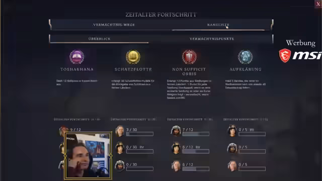 00:25:15Für die heutige Session wird die Aufteilung in zwei Vierer-Gruppen beschlossen, nachdem sich herausstellte, dass das dritte Zeitalter noch nicht multiplayer-tauglich ist. Man entscheidet sich, die erste und zweite Epoche auf einer kleinen Karte zu spielen, wobei das Ziel ist, die meisten Vermächtnispunkte zu sammeln. Die Session soll ohne Rundentimer und mit offenen Chats ablaufen, wobei streng auf Spoiler im Chat geachtet wird.