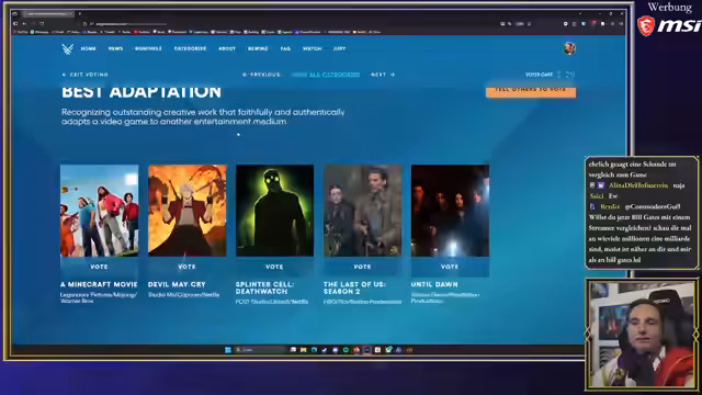 00:21:58Die Kategorie „Meist erwartetes Spiel“ wird als „schwachsinnigste Kategorie“ bezeichnet, da keines der Spiele bisher gespielt werden konnte und alle noch schlecht werden könnten. Obwohl er erwartet, dass GTA gewinnen wird, stimmt er für Witcher, da dies das Spiel ist, das er persönlich am meisten erwartet. Er äußert Zweifel, dass Witcher bereits nächstes Jahr erscheinen wird, tippt eher auf 2027 oder später, und sieht die Kategorie als „nette Fluff-Kategorie“, um Hype zu generieren. Bei der „Besten Adaption“ muss er leider überspringen, da er keine der nominierten Serien oder Filme gesehen hat. Er erwähnt, dass ihn die Devil May Cry-Serie aufgrund der Einbindung von Asmongold und der fehlenden Original-Synchronstimme von Dante abgeschreckt hat, vermutet aber, dass The Last of Us die beste Wahl wäre, hätte er die Adaptionen verfolgt.