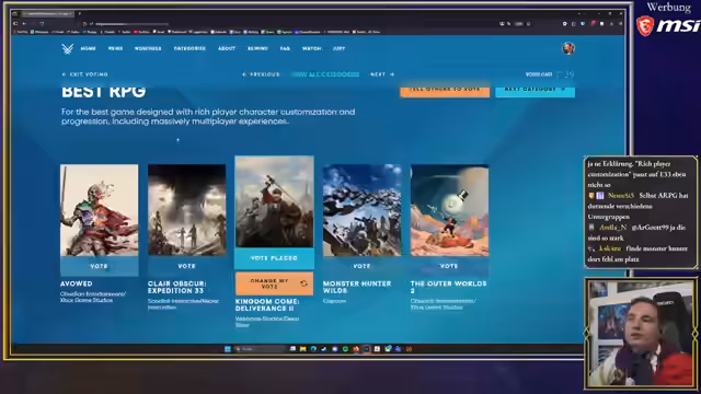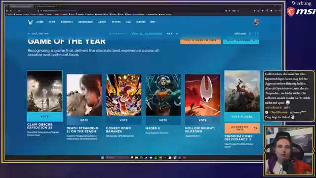 00:47:02In der Kategorie „Bestes RPG“ sieht der Streamer Kingdom Come Deliverance 2 als verdienten Sieger an, obwohl er erwartet, dass Claire Obscure einen „Sweep“ hinlegen wird. Er argumentiert, dass Kingdom Come ein besseres Rollenspiel sei, mit einer immersiveren Welt und stärkeren Rollenspielaspekten, einschließlich Dialogentscheidungen. Er erwähnt auch Avowed und The Outer Worlds 2 als gute, wenn auch kleinere Rollenspiele. Er kritisiert, dass Monster Hunter Wilds, das er als mittelmäßig empfand, überhaupt als RPG eingestuft wird, da der RPG-Begriff sehr weit gefasst sei. Bei „Bestes Action-Adventure“ stimmt er für Indiana Jones and the Great Circle, das für ihn die größte Überraschung war, obwohl er glaubt, dass Hollow Knight Silksong aufgrund seines großen Erfolgs gewinnen wird. Er gibt zu, dass Hardcore-2D-Plattformer wie Silksong nicht sein persönlicher Geschmack sind.