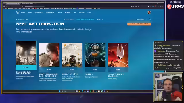 01:59:46Die Kategorie "Best Game Direction" wird ebenfalls Clare Obscure zugesprochen, obwohl Split-Fiction für seine kreativen Koop-Mechaniken als bemerkenswerter Konkurrent genannt wird. Die Entscheidung für das "Spiel des Jahres" ist extrem schwierig, wobei Clare Obscure als wahrscheinlichster Gewinner angesehen wird. Persönlich tendiert der Streamer jedoch zu Kingdom Come 2, da er die Welt des Spiels mehr vermisst und das Weltdesign als herausragend empfindet, obwohl es keine eigene Kategorie dafür gibt. Andere nominierte Spiele wie Hades 2, Donkey Kong und Death Stranding werden als weniger starke Anwärter betrachtet. Es wird betont, dass 2024 ein unglaublich gutes Gaming-Jahr war, mit herausragenden Titeln in vielen Genres, trotz der Probleme in der Gaming-Branche hinter den Kulissen. Die Abstimmung zwischen Clare Obscure und Kingdom Come 2 wird als "unmenschlich" bezeichnet, da beide Meisterwerke sind.