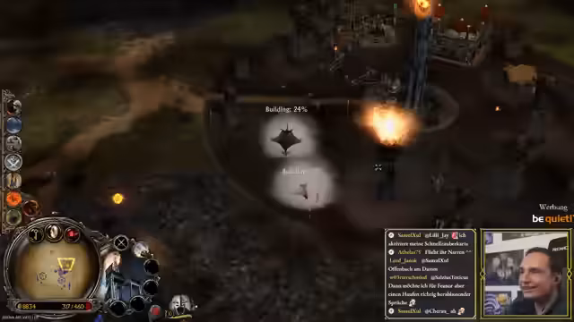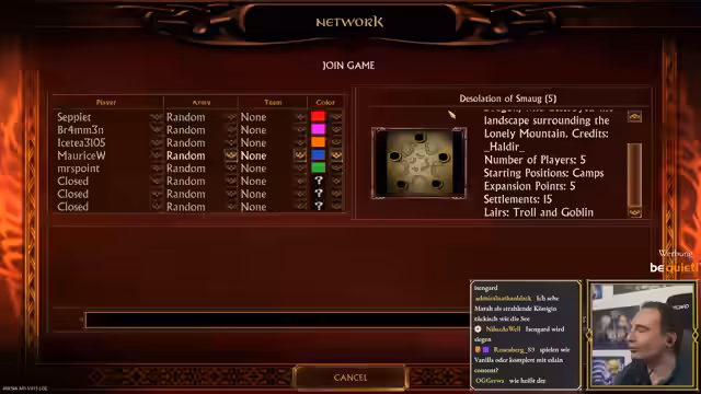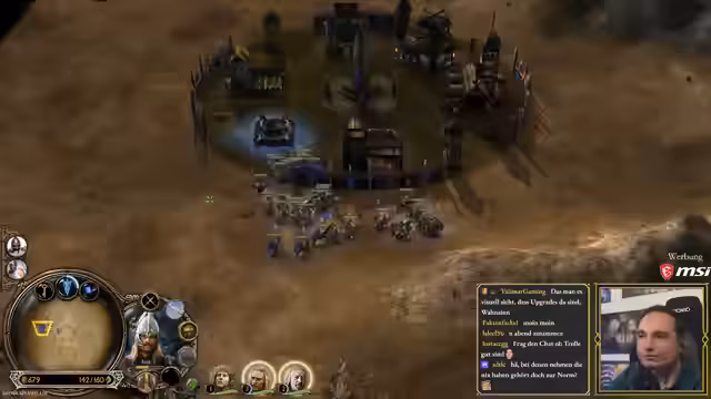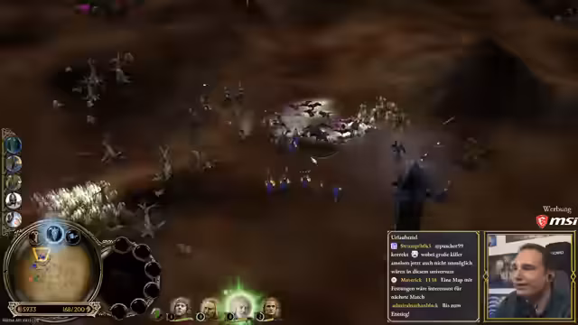 00:46:30Nach diversen technischen Hürden beginnt endlich das Spiel. Die Teilnehmer spielen ein Fünfer-Free-for-All auf einer zufällig ausgewählten Karte. Maurice, als Rohan, wird direkt von seinem Nachbarn angegriffen und verliert erste Gebäude, während andere Spieler wie Brammen ebenfalls in erste Kämpfe verwickelt werden. Er erfährt, dass seine Orks kostenlos sind, was ihm einen taktischen Vorteil verschafft. Die Map, auf der jeder Spieler sein eigenes Gebiet hat, ermöglicht Eroberungen neutraler Lager, was die Dynamik frühzeitig verändert.