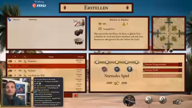 01:33:02Nach der Auswahl von Kahina als Verbündetem startet das Spiel auf einer großen Karte mit neuen Maps und Einheiten. Der Streamer beginnt mit dem Aufbau der Wirtschaft: Er baut Holzhütten, Steinlager, Brotproduktion und später Brauereien. Er nutzt neue Features wie Autoverkauf und Sammelpunkte. Die Ressourcenverteilung ist wichtig, besonders die Kontrolle über die Eisenminen.