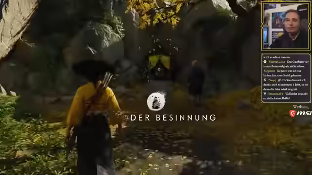 02:07:12Der Streamer erlebt erste Kämpfe und erlernt die Grundlagen des Kampfsystems in Ghost of Tsushima. Dazu gehören Blocken, Parieren und die Nutzung des Geistesystems zur Heilung. Er wird in einen Kampf mit betrunkenen Gegnern verwickelt, den er erfolgreich meistet. Im Anschluss unternimmt er einen Flashback in seine Kindheit, um im Trainingsschwertkampf gegen seinen Bruder anzutreten und dabei die Grundlagen des Kampfs zu erlernen.