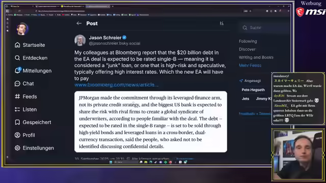 00:11:47Der Stream beginnt mit der Ankündigung, dass Electronic Arts (EA) für 55 Milliarden Dollar an ein Investorenkonsortium verkauft wird, das vom saudi-arabischen Public Investment Fund (PIF) unter der Leitung von Kronprinz Mohammed bin Salman angeführt wird. Zusätzlich ist Jared Kushner, Donald Trumps Schwiegersohn, über seine Investorenfirma beteiligt. Dies wird als eine "unheilige Allianz" kritisiert, da der saudische Kronprinz beschuldigt wird, Journalisten in Konsulaten verschwinden zu lassen, während Kushner die Werte einer rechten christlichen Regierung in den USA repräsentiert. Es wird hervorgehoben, dass 20 Milliarden Dollar der 55 Milliarden Dollar ein Kredit von JP Morgan sind, der EA aufgebürdet wird, was den finanziellen Druck auf das Unternehmen erhöht. Es wird spekuliert, dass EA dadurch noch stärker auf Kürzungen, finanzielle Effizienz und Monetarisierung setzen könnte. Der Streamer betont, dass Saudi-Arabien bereits zuvor Anteile an EA hielt und auch in anderen Gaming-Unternehmen wie Embracer investiert ist. Die Übernahme wirft die Frage auf, wie sich dies auf die Spiele und die darin transportierten Werte auswirken wird. Als Beispiel wird Cristiano Ronaldo genannt, der als Markenbotschafter für den saudi-arabischen Tourismus auftritt und in dem Kampfspiel Fatal Fury als Kämpfer auftritt, da das Spielstudio SNK zu 97% Saudi-Arabien gehört.