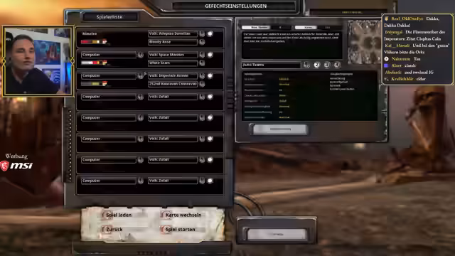 03:35:06Der Streamer beschließt, einen neuen Spielmodus zu versuchen, eine Acht-Spieler-Map. Er entscheidet sich für einen Kampf zwischen Ordnungs- und Chaosvölkern. Er erwähnt den Mod-Browser, ist sich aber unsicher, wie man Mods für die Definitive Edition installiert. Er wolle die Mods vor einem Stream vorbereiten, nicht live testen. Er fragt die Chat-User, welche Völker sie spielen möchten und entscheidet sich für Chaos, Dark Elder und Sororitas.