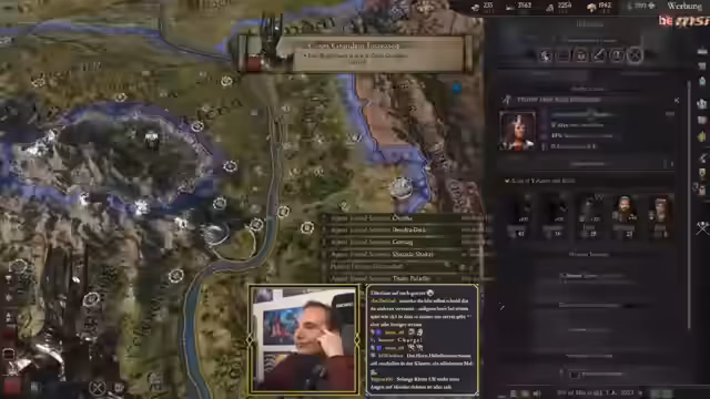 04:03:23Nach der Schlacht gerät das Reich in tiefe Krise. Zahlreiche Vasallen erklären ihre Unabhängigkeit, was zu mehreren, gleichzeitig geführten Kriegen führt. Der Streamer ist überfordert, kann den Kriegszügen nicht mehr effektiv entgegenwirken und verliert immer mehr Territorien an rebellierende Fraktionen. Das Reich droht auseinanderzufallen.