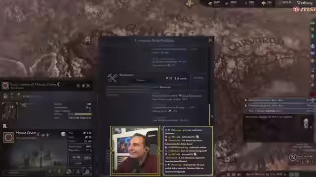 00:41:29Nach einer kurzen Unterhaltung und technischen Anpassungen startet das Spiel. Der Streamer zeigt seine Startposition als Sauron in Mordor. Er hebt hervor, dass Sauron spezielle Eigenschaften hat: er ist 21.405 Jahre alt, ist ein Maya mit Kampfboni, kann aber keine Kinder haben und ist daher 'ehrenlos'. Sein Hof besteht aus mächtigen Vasallen wie dem Hexenkönig und dem Mund von Sauron, sowie einigen schwächeren Orks. Der Streamer beginnt, seine Gebäude in Barad-Dur auszubauen und strategische Entscheidungen zu treffen, wie die Annahme einer 'Major Decision', um den Kult der Weißen Hand zu verbreiten und Dunländer zu rekrutieren.
