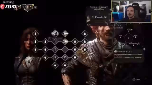 03:56:45Der Streamer untersucht das Attributsystem und den Charakterfortschritt in Claire Obscure Expedition 33. Er stellt fest, dass die Skalierung der Elemente zunächst seltsam erscheint, da ein Frost-Element bei Gustav genutzt wird. Die Charaktere können durch verschiedene Waffen mit unterschiedlichen Skalierungen ausgerüstet werden, was den Schaden verdoppeln kann. Der Streamer vermutet, dass die Skalierung wichtiger wird, wenn man S-Skalierungen findet. Bisher scheint es jedoch eher unwichtig zu sein, und es gibt nur begrenzte Möglichkeiten zum Respecken des Charakters.