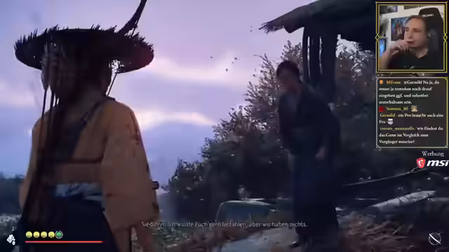 03:43:35Der Streamer erkundet die Spielwelt von Ghost of Yotei systematisch, wobei er auf das Einholen von Ressourcen, das Erlernen neuer Kampftechniken und die Interaktion mit der Umgebung fokussiert ist. Er nutzt sein Pferd, um sich fortzubewegen, und versucht, Punkte auf der Karte abzuklappern, wobei er auf markierte Objekte wie Bambus und leere Sarkelkrüge stößt. Ein besonderes Augenmerk liegt auf dem Training des Kampfsystems, das er als fesselnd und hoch tödlich beschreibt, da sowohl der Spieler als auch die Gegner schnell aus dem Gleichgewicht gebracht werden können.