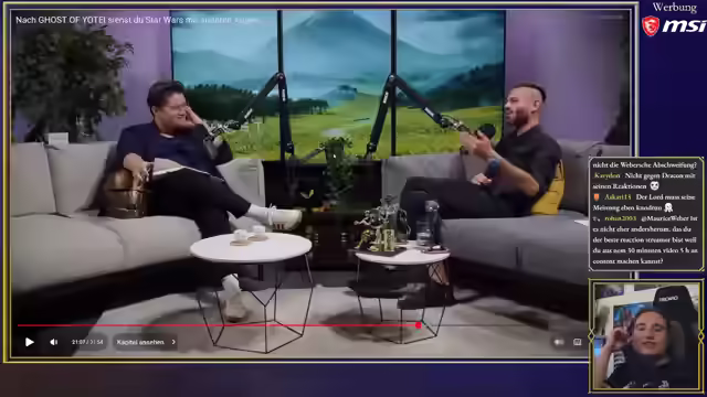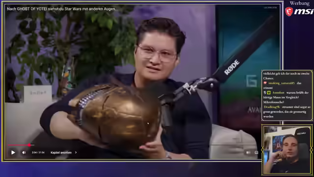 01:33:34Betont die Expertise von Marco im Bereich Nerdkultur und Filmanalyse und bedauert, selbst nicht mehr so viele Filme und Serien zu schauen. Im Video mit Nino werden kontroverse Meinungen und Engagement gefordert, was zu humorvollen Beiträgen im Chat führt. Es wird auf die Bedeutung von Nerdkultur und japanischer Kultur eingegangen. Ein Helm wird als Aufhänger genutzt, um über Samurai-Helme und deren Bedeutung zur Kompensation der Körpergröße zu sprechen. Es wird ein Vergleich zu Pickelhauben gezogen, die aufgrund der geringeren Kopfgrößen der Soldaten nicht passen würden. Abschließend wird die Faszination für Ghost of Yotei und den Kurosawa-Modus hervorgehoben, sowie die Möglichkeit, Fotos im Spiel zu machen und auf Instagram zu teilen.