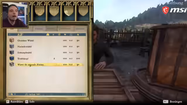 00:58:04Nach einer humorvollen Einführung in das Gameplay am Vortag, in der Heinrich ein ganzes Banditenlager aus Rache für einen Betrug bei einem Würfelspiel ausgelöscht hat, beginnt der Streamer damit, die erbeutete Beute zu verkaufen und die Ausrüstung zu verbessern. Er verkauft Waffen, kauft neue Rüstungsteile mit mehr Charisma und verbessert sein Equipment systematisch, um sich auf die bevorstehenden Herausforderungen vorzubereiten.