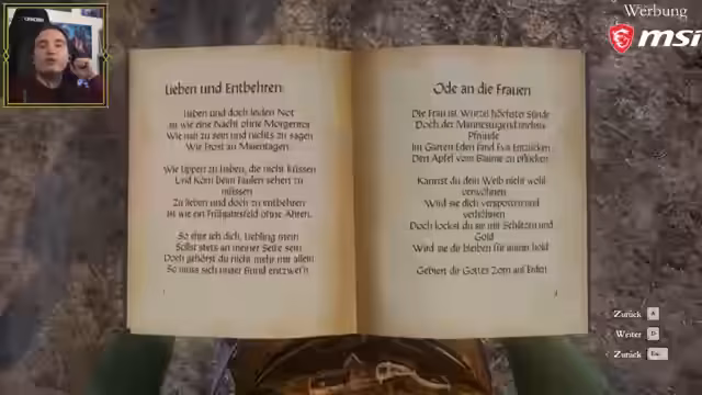 01:52:30Der Stream widmet sich dem DLC 'The Amorous Adventures of Bold Sir Hans Capon', in dem es um das Werben für Carolina geht. Gedichte müssen auswendig gelernt und vorgesprochen werden. Gleichzeitig wird das offizielle deutsche Release-Event für Kingdom Come: Deliverance 2 am Dienstag um 17 Uhr angekündigt, das live gestreamt wird und mit einer Giveaway verbunden ist.