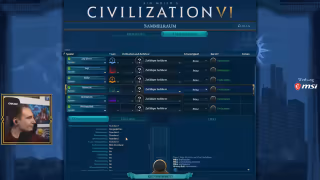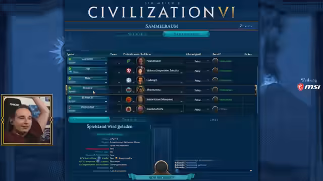 00:51:00Das geplante Civilization VI Event startet mit technischen Vorbereitungen und Problemen. Da nicht alle Teilnehmer einen Ping von null zum Host hatten, mussten die Spieler nacheinander neu verbinden. Über die Vorauswahl der Zivilisationen gab es Diskussionen und Scherze, wobei sich einige Spieler Vorteile für den Neuling der Runde versprachen. Das Spiel selbst wird auf einer neuen Version mit angepassten Barbaren-Einstellungen laufen, um ein ausgewogenes und spannendes Erlebnis zu gewährleisten. Die Moderatoren wurden gebeten, den Chat zu überwachen, um keine strategischen Tipps preiszugeben.