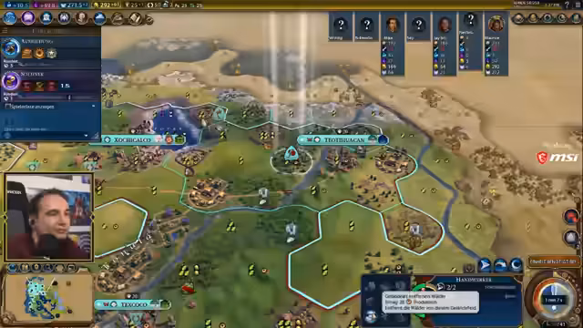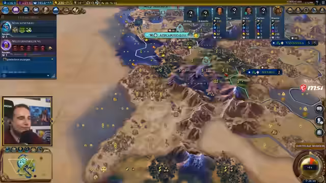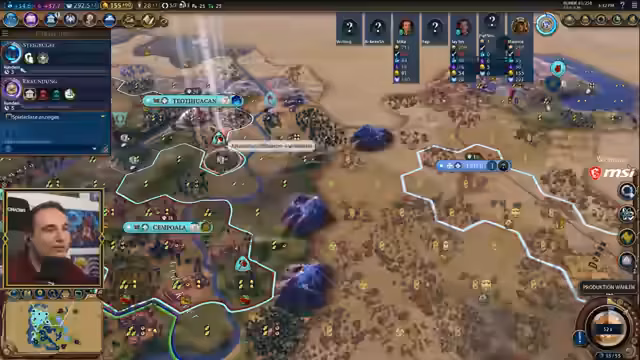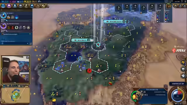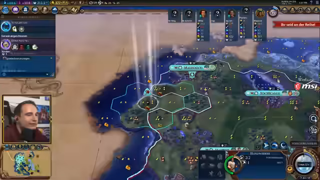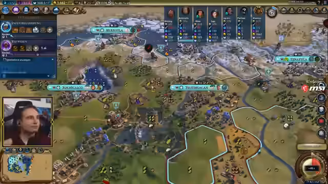 04:47:26Im weiteren Spielverlauf mehren sich diplomatische Spannungen. Während der Streamer beteuert, friedfertig zu sein, bereiten sich andere Spieler auf einen Angriff vor. Beobachtet wird insbesondere, dass der Spieler Sepp seine militärische und wissenschaftliche Macht ausbaut, was bei den anderen Spielern für Besorgnis sorgt. Der Streamer selbst entscheidet sich für eine vorsichtige Taktik, indem er sich auf wirtschaftliche Stärkung konzentriert und mit Geld in zukünftige Kriege anderer investieren will, um selbst davon zu profitieren.