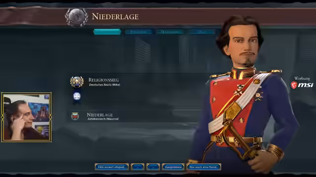 05:44:35Ein unerwarteter Wendung tritt ein, als Spieler Mike den Religions-Sieg erringt. Er hat die gesamte Zeit über Missionare strategisch eingesetzt, ohne dass es die anderen Spieler bemerkt haben. Besonders der zeitgleiche Bekehrungsprozess in den letzten Runden wird als 'sneaky' und 'big brain move' gelobt. Der Sprecher, Maurice und Sepp sind von dieser schnellen Wendung überrascht und die vorherigen militärischen Auseinandersetzungen werden im Kontext des finalen Sieges weniger relevant. Maurice wird für seinen Klimawandel kritisiert, während der Sieg von Mike als verdient angesehen und gefeiert wird.