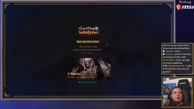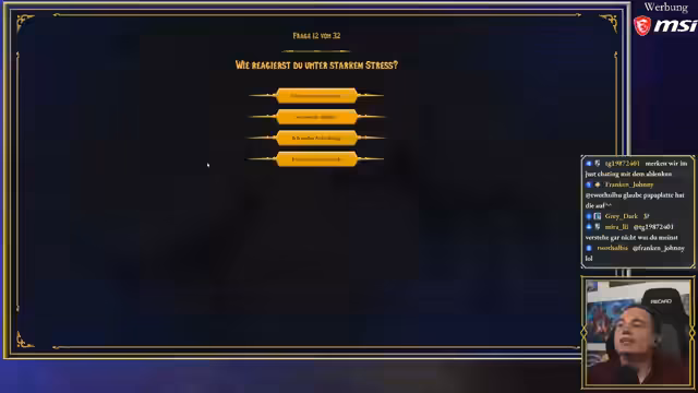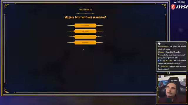 06:38:08Der Streamer gibt die Antworten des Sauerkraut-Folks-Quiz ein. Die Fragen beziehen sich auf Persönlichkeitseigenschaften, Vorlieben, Reaktionen unter Stress und Humor. Nach der Beantwortung mehrerer persönlicher und situativer Fragen wie Humor, Umgang mit Unordnung oder Entscheidungsfindung unter Zeitdruck, wird das Ergebnis präsentiert. Er wird als Nachtelf eingestuft, was ihn zunächst enttäuscht, da er sich mit den Eigenschaften Harmonie, Natur, Spiritualität und Geduld nicht identifizieren kann. Dennoch akzeptiert er das Ergebnis der Persönlichkeitsanalyse.