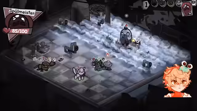 05:26:29Der Kampf gegen den Endboss, den 'Spülmeister', beginnt und gestaltet sich chaotisch. Der Streamer erhält den Status 'crazy', der durch ein Item ausgelöst wird. Die Team-Katzen werden durch AOE-Schaden und spezielle Fähigkeiten des Bosses dezimiert. Eine hektische Abfolge von Heilungen, Angriffen und Bewegungen ist nötig, um den Ansturm zu überstehen.
