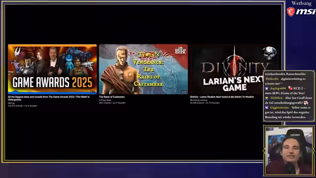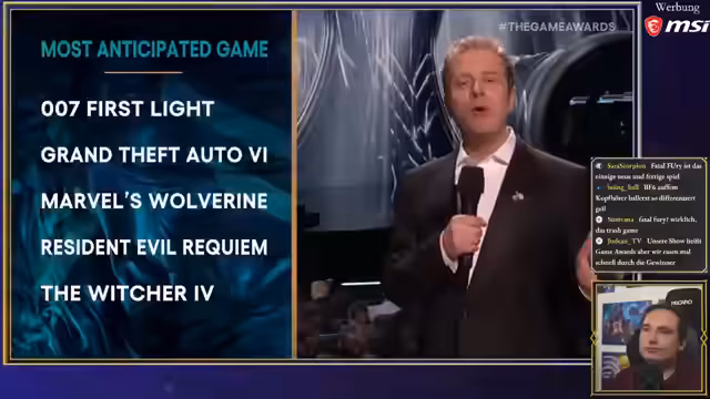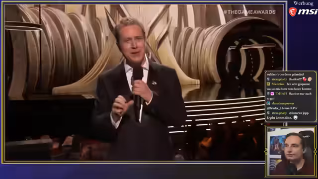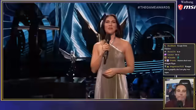 01:14:24Der Livestream beginnt mit der Ankündigung, dass alle Trailer und Awards vollständig gezeigt werden, ohne Überspringen. Nach einem musikalischen Auftritt von Evanescence werden die ersten Nominierungen für Best Family Game bekannt gegeben. Die Diskussion fällt hier negativ aus, da die Kategorie als nicht relevant für den Streamer eingestuft wird. Split Fiction wird als Favorit genannt, während Donkey Kong gewinnt. Es folgt ein Trailer für ein Spiel mit mittelalterlicher Burg-Ästhetik und ungewöhnlichen Waffen, das auf die Wishlist gesetzt wird, aber als Rhythmus-Spiel nicht dem Geschmack entspricht.