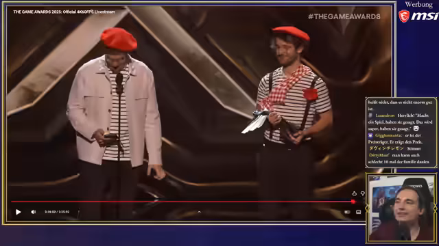 02:11:19Clair Obscur gewinnt Best Indie Game, was eine emotionale Dankesrede des Komponisten mit Gitarren-Auftritt auslöst. Der Streamer verteidigt den unkonventionellen Stil gegen Kritik und betont, dass Genießen des Moments wichtiger ist als Perfektion. Ebenso werden Hades 2 und Ninja Gaiden 4 als Gewinner in anderen Kategorien gefeiert. Doom wird als intensiv gelobt, während Hades 2 trotz leichter Enttäuschung gegenüber dem Vorgänger anerkannt wird. Die Dankesreden heben die Gemeinschaftsleistung und Inspiration durch andere Teams hervor.