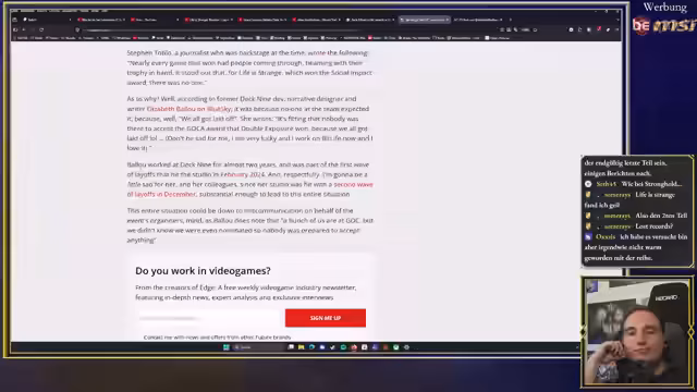 02:33:52Während des Spiels denkt der Streamer über seine Zeit mit League of Legends während des Studiums nach. Er erzählt, er habe die Weltmeisterschaften angesehen und dass er nur wegen eines netten Verwalters sein Studium bestanden hat. Er gibt jedoch auch zu, dass ihn League of Legends negativ beeinflusste und ihn zu einem schlechteren Menschen machte, da er viel Zeit in ähnlichen, repetitiven Runden investierte und nach einer Weile kein Interesse mehr an einem rein kompetitiven Multiplayer-Spiel hatte.