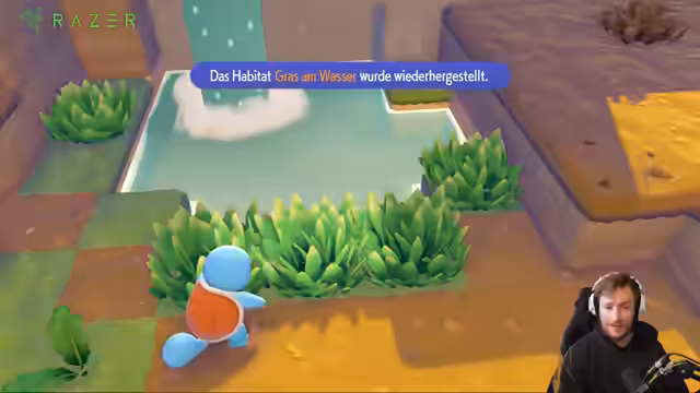 01:33:39Der Streamer erkundet verschiedene Lebensräume und stellt fest, dass sich die Verteilung der Pokémon geändert hat. An der Küste entdeckt er ein Skorpion-Pokémon, Skorpiomon, dessen Anwesenheit er als gefährlich einschätzt. Im Inland versucht er, ein Habitat für Horniglumanda zu erstellen, benötigt dafür jedoch spezielle wie einen Strohsitz und einen Strohtisch, was ihn zunächst in Schwierigkeiten bringt.