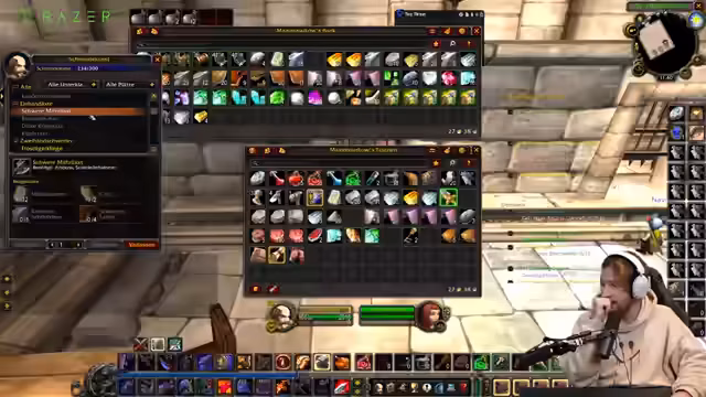 01:35:07Der Streamer und sein Gruppenmitglied Chromi farmen aktiv nach Rezepten für seine Schmiedeberuf. Sie nutzen den 'Layer-Trick', indem sie zwischen verschiedenen Instanzen-Schichten wechseln, um die Händler-Shops zu aktualisieren und seltene Rezepte wie das 'Mondstahlbreitschwert' zu finden. Dieses systematische Vorgehen ist notwendig, da der Content der WoW-Classic-Jubiläumsedition an Popularität gewonnen und das Farmen dadurch erschwert hat.