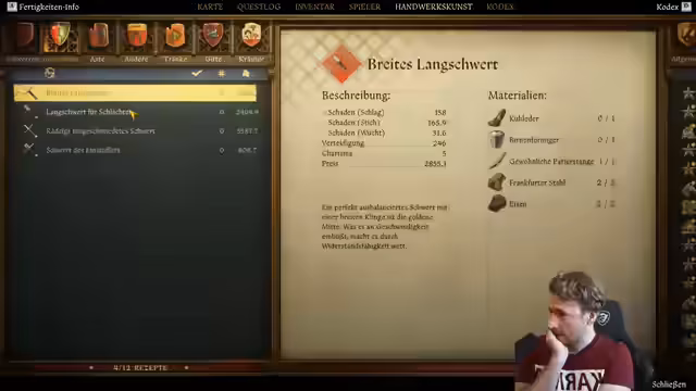 03:56:01Nach einer kurzen Unterbrechung, um sich zu setzen und eine Lesebrille zu benutzen, setzt der Streamer sein Vorhaben fort. Er liest Schmiedeanleitungen, um bessere Waffen herzustellen, und findet heraus, dass ein selbstgemachtes Breitschwert besser ist als das gekaufte. Allerdings fehlen ihm noch bestimmte Materialien wie Frankfurter Stahl und Parierstangen. Er kehrt in sein Quartier zurück, um seine Truhe zu durchsuchen und den nächsten Schritt zu planen.