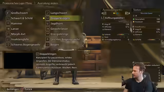 00:16:32Der Streamer untersucht die Kontermechanik des Langschwerts und vergleicht sie mit Parry-Systemen in Soulslike-Spielen wie Elden Ring. Es wird festgestellt, dass der Konter in Monster Hunter eher dazu dient, den Spielfluss aufrechtzuerhalten als einen High-Risk-High-Reward-Move darzustellen. Verschiedene Waffen werden getestet, darunter Lanze, Schild und Schwert, wobei der Streamer die Blockmechanik des Schildes als vielversprechend empfindet. Es wird versucht, den perfekten Block zu meistern, was jedoch Ausdauer und HP kostet. Der Schild und Schwert erweist sich als schneller und mobiler im Vergleich zur Lanze. Der Streamer experimentiert mit verschiedenen Angriffskombinationen und stellt fest, dass der Schildangriff Plant Damage verursacht und Gegner betäuben kann. Die Kontermechanik des Schildes wird als positiv hervorgehoben, da sie offensive Aktionen ermöglicht. Es wird festgestellt, dass das Schwert aufgrund seiner gut funktionierenden Kontermechanik bisher der Favorit ist. Die Lanze hingegen wird als unhandlich empfunden. Die Insektenklebe wird ebenfalls kurz getestet, aber als weniger zufriedenstellend befunden.