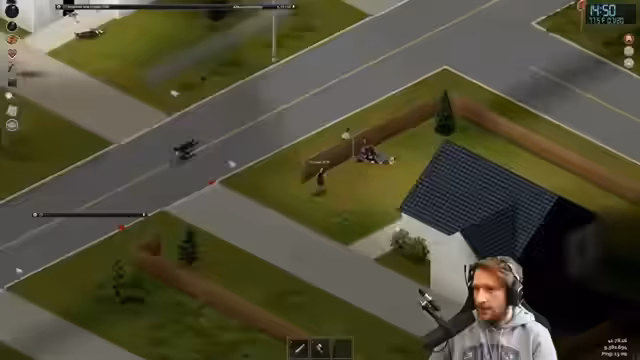 01:52:22Der Streamer erkundet die Umgebung und findet einen Van, den er als sein eigenes in Besitz nimmt. Gleichzeitig erlebt er erste technische Probleme mit dem Fahrzeug, wie den plötzlich leer gefahrenen Tank. Er kommt auch in sein Haus zurück, das jedoch leer ist, und beginnt mit dem Ausrüsten und der Verteidigung gegen Zombies. Ein Angriff von hinten führt zu seinem ersten Tod, was ihn frustriert, aber auch motiviert, seine Strategie zu überdenken und weiterzukämpfen.