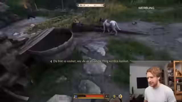 00:26:34Nach dem Verkauf von Überflüssigem und der Entscheidung, das gestohlene Pferd zu nutzen, reitet der Streamer mit dem Tier zu einem Nomadenlager. Dort raubt er einige NPCs aus und stiehlt später ein weiteres Pferd. Auf dem Rückweg nimmt er einen Wilderer fest, um eine Quest für den Vogt von Trostkowitz abzuschließen, der ihn für seine Effizienz lobt und ihm eine neue, anspruchsvollere Wilderer-Quest am Wittlackteich gibt.