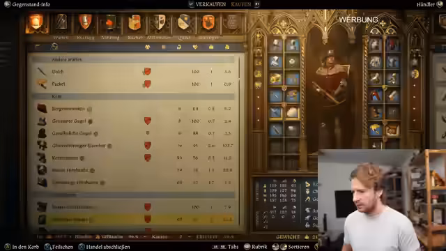 00:00:00Der Stream beginnt mit der Begrüßung der Zuschauer. Die ersten Minuten drehen sich um die Rückkehr des Streamers in das Spiel nach einer Messe und einer Mischung aus Arbeit und Freizeit. Es fällt ihm schwer, sich wieder mit dem Controller vertraut zu machen, da er hauptsächlich mit Maus und Tastatur gespielt hat. Der Fokus liegt zunächst auf der Bereinigung des Inventars, dem Verkauf von schweren und wertlosen Gegenständen und der Überlegung, ob ein gestohlenes Pferd behalten oder verkauft werden soll.
