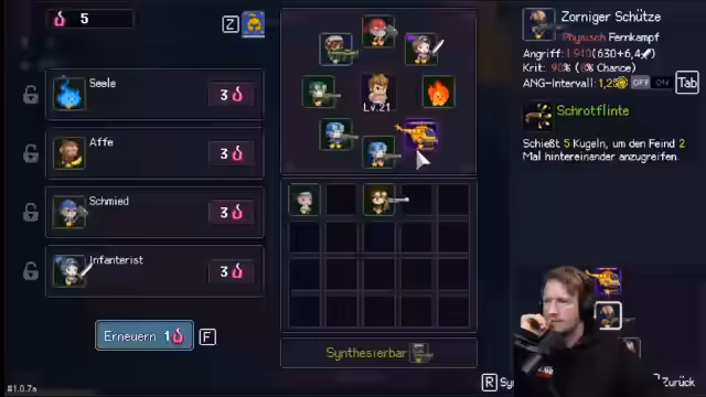 04:01:46Vor dem Endbosskampf wird das Niveau erhöht, um stärker zu werden. Es werden nochmals alle Räume abgeklappert, um die letzten benötigten Einheiten wie den "Revolvermann" zu finden, da deren Vorkommen als "toll" aber nervig beschrieben wird. Die Herausforderung besteht darin, schnell genug die Ressourcen zu finden, um die Einheiten zu entwickeln, bevor der Boss erscheint.