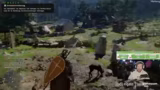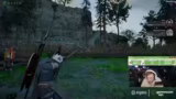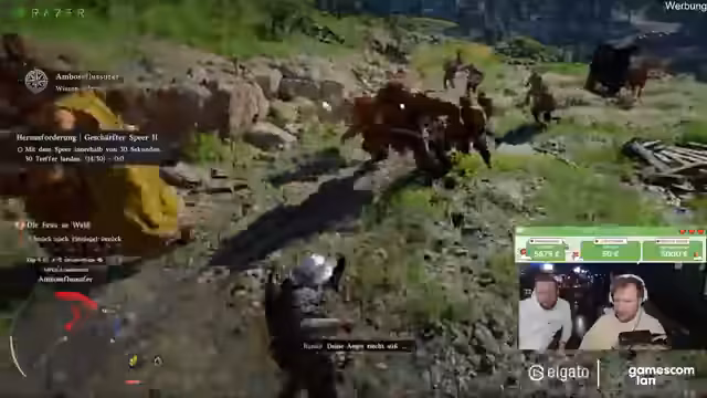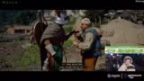 00:11:11Nachdem er in der Stadt die Hauptquest fortgesetzt hat, testet der Streamer die Kampfmechaniken aus. Er trainiert mit einem Speer und wechselt die Waffe, um sich an die Steuerung zu gewöhnen. Später gerät er in eine Situation, in der er gegen eine Wache in einem Armring-Kampf antreten muss, was als Mini-Spiel dient und sein Geschick auf die Probe stellt.