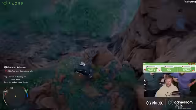 05:08:01Ein zentrales, langes Ereignis ist der Transport eines schweren Gesetzlosen, den der Streamer fangen musste. Der Weg ist kilometerlang und er unternimmt mehrere Versuche, den Gefangenen zu transportieren, inklusive werfen und sogar werfen von Tieren. Der Höhepunkt ist ein Transportunfall, bei dem der Gefangene von einer Klippe fällt und bewusstlos liegen bleibt, was die Quest aber nicht scheitern lässt.