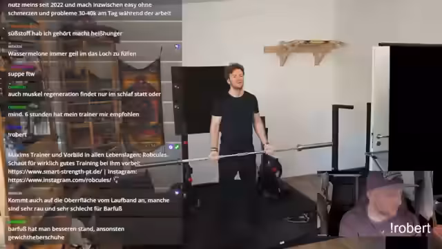 00:53:52Streamer spricht über die Vorteile von Barfußlaufen gegenüber dem Tragen von Schuhen. Barfuß trainiert die Fußmuskulatur besser und der Fuß ist nicht mehr in engen Schuhe eingeklemmt. Er rät dazu, zuerst eine gewisse Menge barfuß zu laufen und dann langsam zu steigern. Fürs Walking Pad sind komplett platte Schuhe oder barfuß ideal, Gewichtheberschuhe verbieten sich wegen der Fersensprengung.