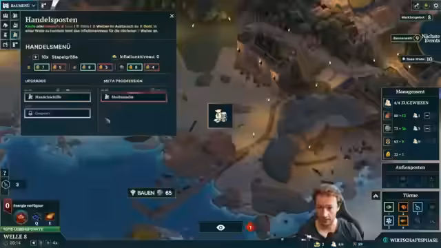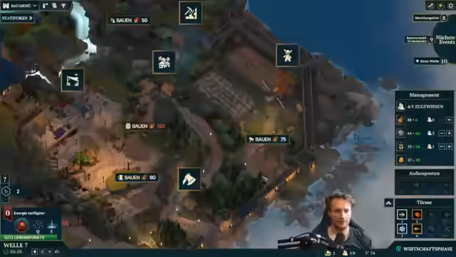 03:36:55Der Streamer testet verschiedene Turmeigenschaften und Effekte. Er analysiert die Reichweite eines bestimmten Turms, die jedoch als zu kurz bewertet wird. Handelsschiffe werden als Goldquelle pro Runde ohne den Einsatz von Arbeitern hervorgehoben. Außerdem wird die Funktion eines Handelspostens getestet und dessen Potenzial für das Spiel bewertet.