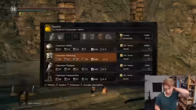 00:20:55Der Streamer konzentriert sich auf die Verbesserung seines Charakters. Er plant, die Waffe auf +15 zu schmieden und verschiedene Statistiken zu leveln, wie Geschicklichkeit für die Waffenskalierung und Ausdauer. Die Ausstattung wird optimiert, indem Rüstungsteile mit guter 'Poise' (Haltung) ausgewählt und der Balderschild geholt wird, um den Spielstil parry-fähig zu gestalten.
