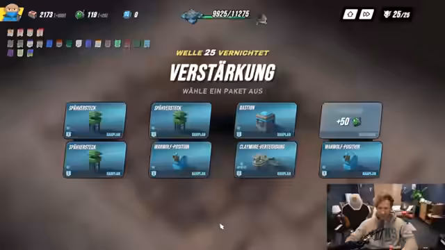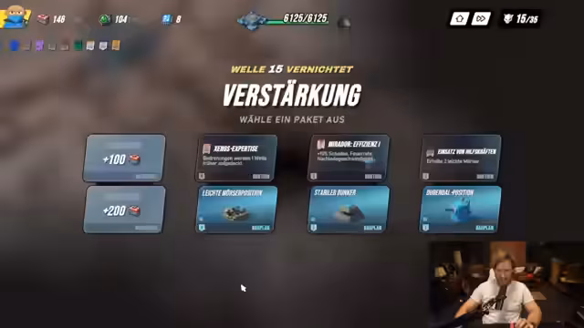 01:47:36Der Stream beginnt mit technischen Problemen, da der Streamer das Game hören kann, aber nicht weiß, wo die Boxen sind. Er startet ein Neues Spiel, muss aber die Route mehrmals umständlich umlegen und macht einen Neustart. Anschließend konzentriert er sich auf das Sammeln von Cash für Detach in der Anfangsphase und plant, Kanonen zu bauen, sobald er sie hat. Er entscheidet sich, die Bunker zu bauen, da sie Bonus-Effekte haben, und baut einen Dorendal, der fünf Prozent mehr Schaden anrichtet.