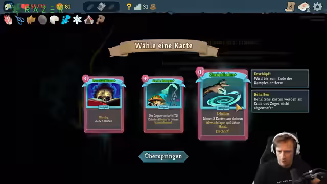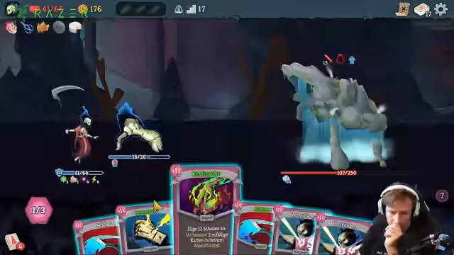 04:02:52Der Streamer stößt auf einen schwierigen Gegner, der sich selbst Schaden zufügt und dessen Aktionen den Spielverlauf komplizieren. Karten wie 'Verzückt' werden als extrem problematisch identifiziert, da sie die Spielstrategie zwingen und Kombomöglichkeiten zerstören. Die Entscheidung, welche Karte als nächstes gespielt wird, wird sorgfältig abgewogen. Die Dynamik zwischen 'Verderben' und 'Verbessern' wird diskutiert und das Ziel, den Gegner effizient zu besiegen, steht im Mittelpunkt der Analyse.