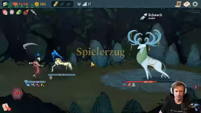00:10:17Der Streamer steht vor einem besonders mächtigen Gegner. Nachdem er zunächst Schwierigkeiten hat, findet er mit einer Kombination aus Block, Schwach-Debuffs und gezieltem Schaden einen Weg, um den Gegner zu besiegen. Dieser Sieg beendet den Streamer-Livestream erfolgreich. Im Anschluss reflektiert er über das Spiel, seine Strategie und die Balance zwischen Angriff und Verteidigung und schätzt das Indie-Game als sehr gelungen ein.